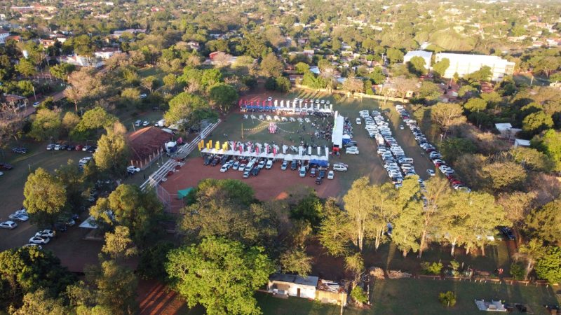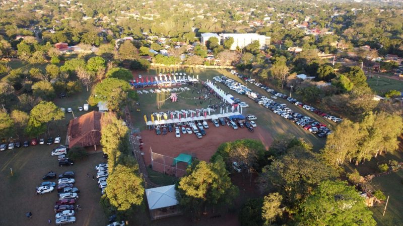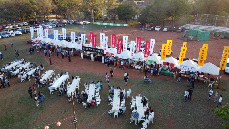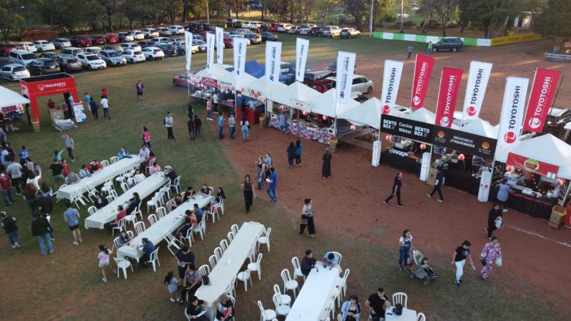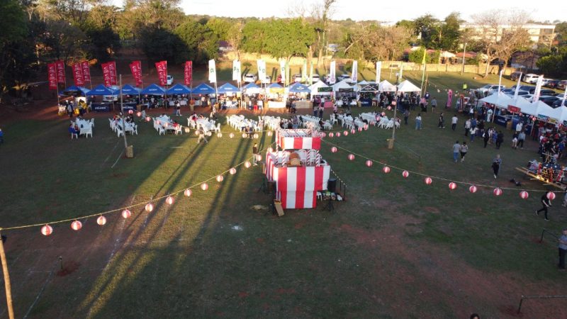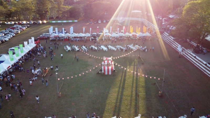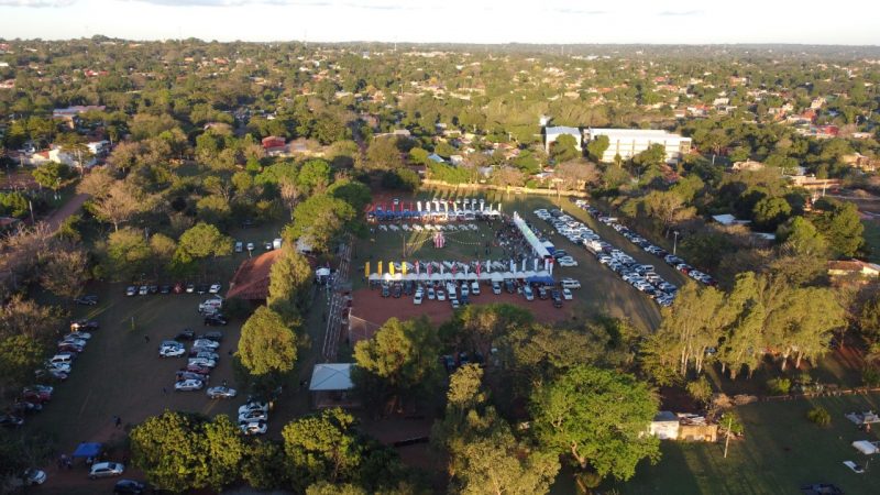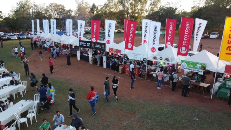 Paisajes panorámicos del Nihon Matsuri desde el cielo con un dron. Actualmente, hay muchos árboles, pero está en una zona residencial. También hay un edificio moderno cerca.