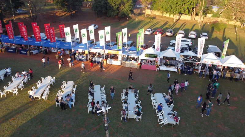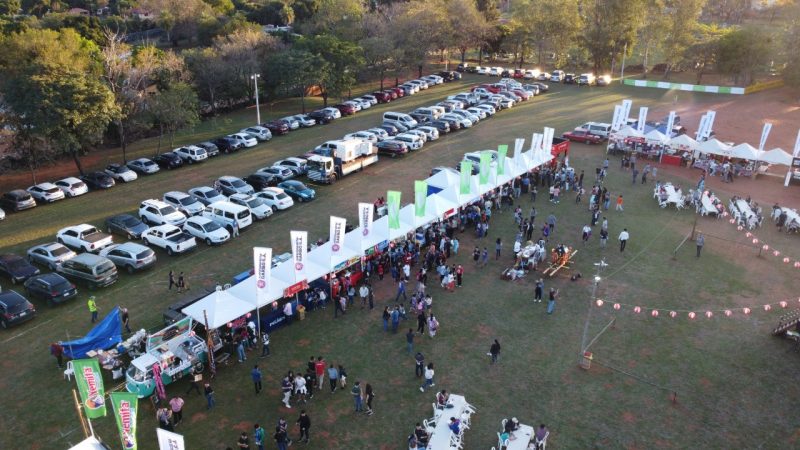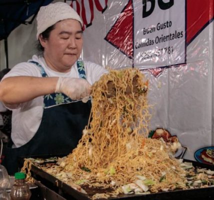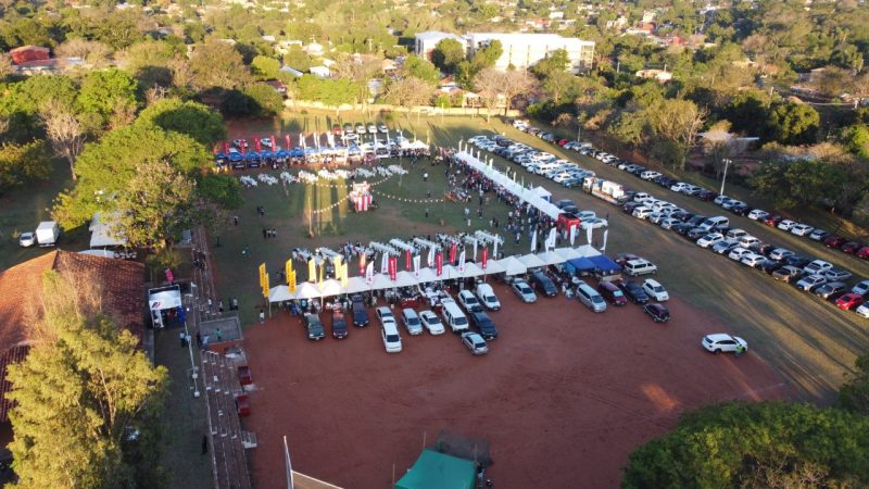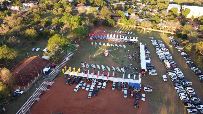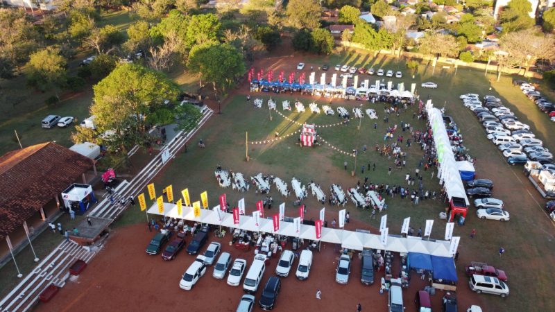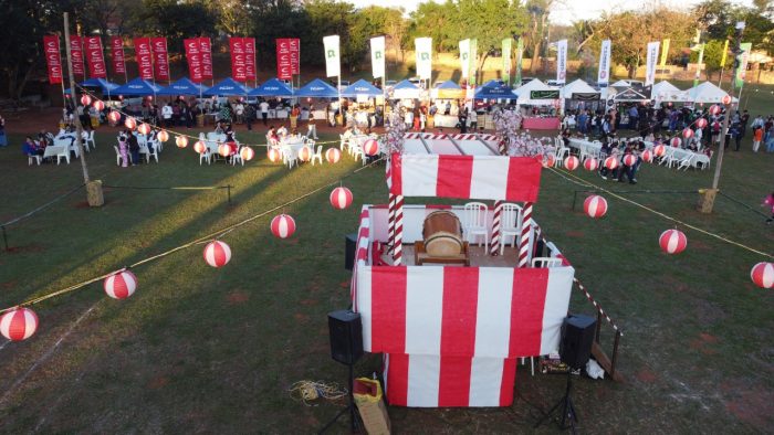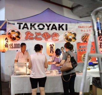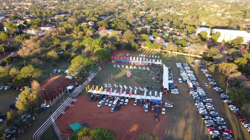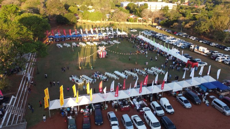 Paisajes panorámicos del Nihon Matsuri desde el cielo con un dron. Actualmente, hay muchos árboles, pero está en una zona residencial. También hay un edificio moderno cerca.